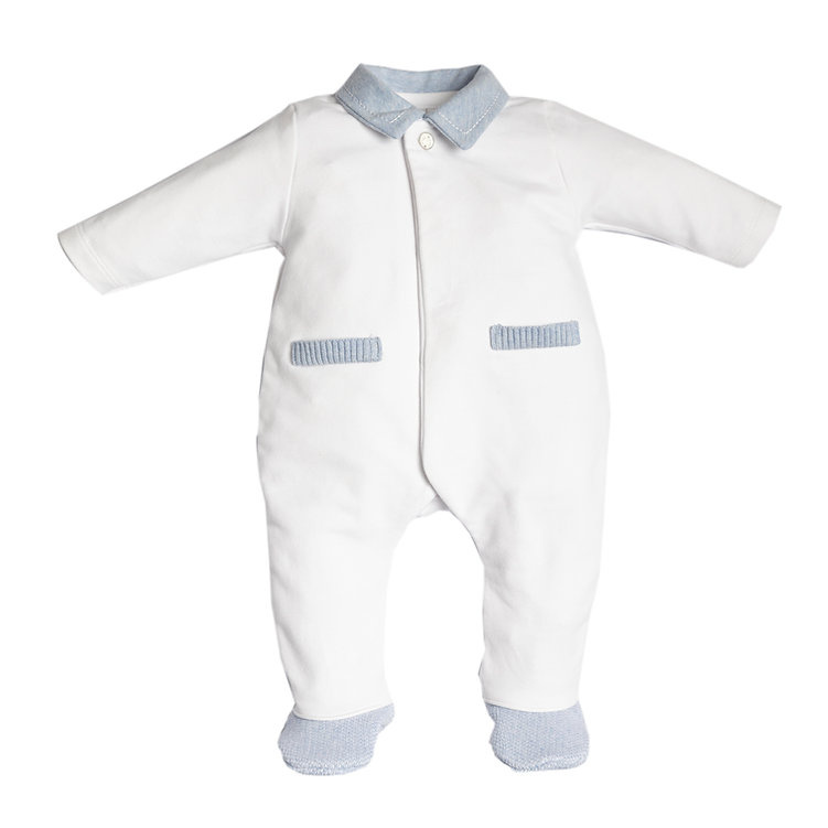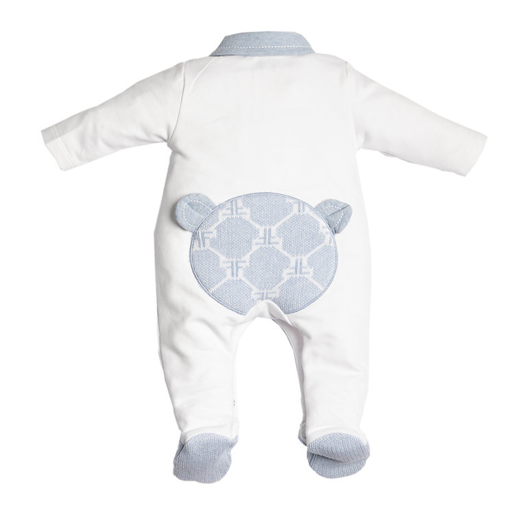 Weicher, weißer Baby-Strampler mit langen Ärmeln und Füßen. Auf der Rückseite befindet sich eine Jacquard-Applikation eines Teddybären mit dem charakteristischen Monogrammmuster. Der Strampler ist mit einem passenden Jacquard-Kragen und kontrastierenden Sohlen versehen. Ein verspieltes und elegantes Kleidungsstück mit charmanten Details am Rücken.