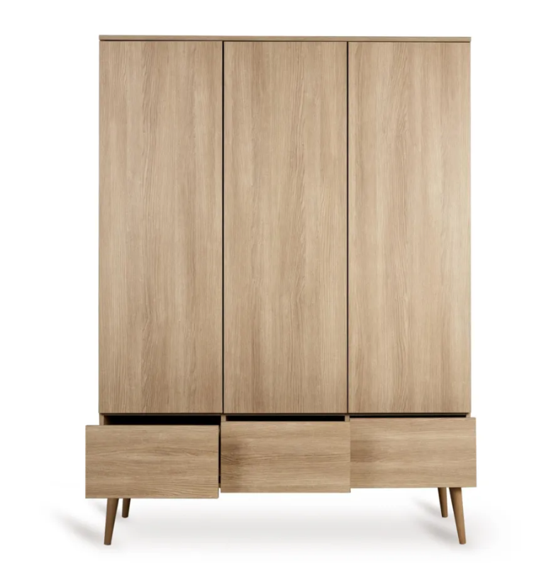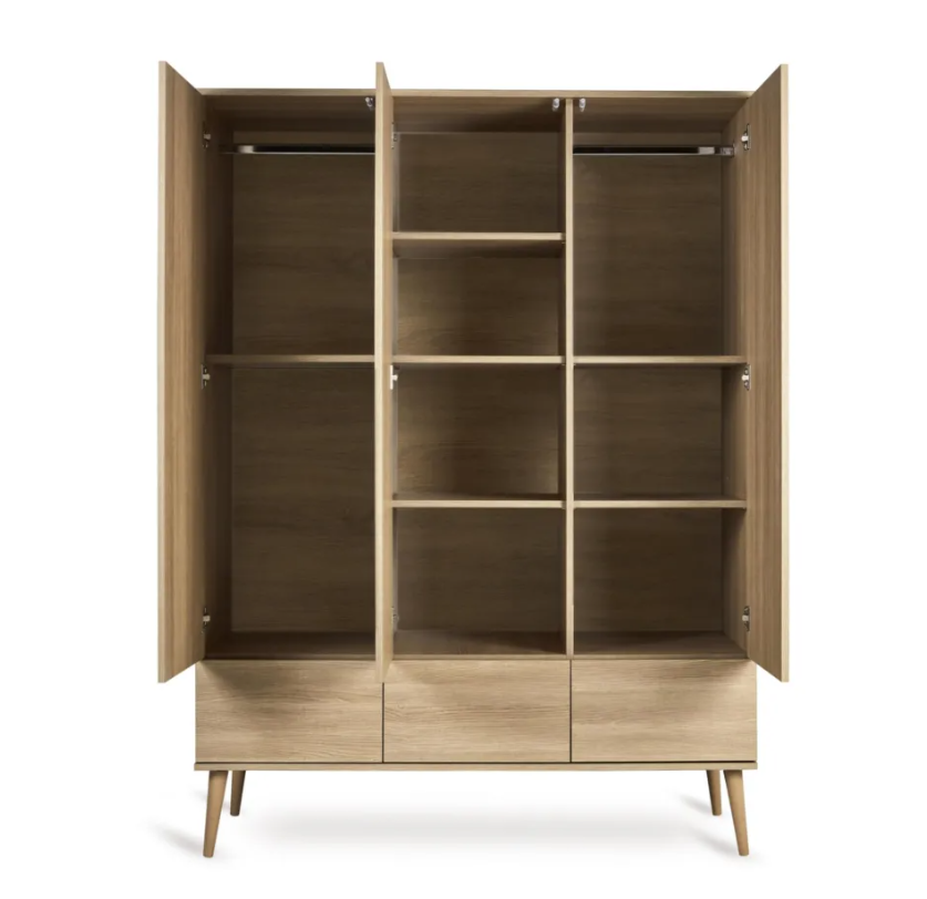 Mit den Maßen 144 x 196 x 58 cm bietet der Flow Cabinet XL viel Platz. Der Schrank verfügt über sechs praktische Regale und zwei Kleiderstangen, sodass Sie Kleidung und andere Gegenstände problemlos aufbewahren und organisieren können. Darüber hinaus ist der Schrank mit drei Schubladen und drei Türen ausgestattet, die alle über ein Push-System für ein elegantes, griffloses Finish verfügen. Die unsichtbaren Griffe tragen zum eleganten, modernen Erscheinungsbild des Schranks bei.