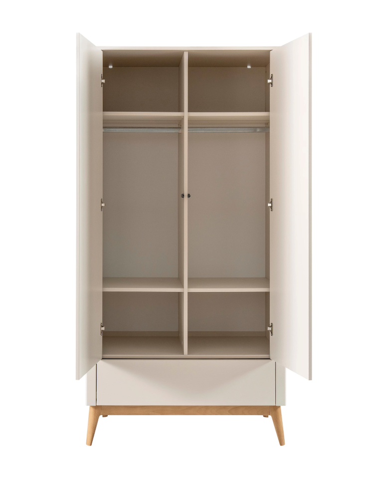 L'armoire 2 portes Seth en champagne élégant est une armoire élégante et pratique qui s'intègre parfaitement dans une chambre d'enfant ou de bébé. Ce meuble allie un design moderne à des rangements astucieux et des finitions de haute qualité. L'armoire est équipée de deux portes qui donnent accès à un intérieur spacieux avec des étagères et une tringle à vêtements. De cette façon, vous pouvez organiser soigneusement les vêtements pliés et les objets suspendus. En bas se trouve un grand tiroir idéal pour ranger des objets comme de la literie, des vêtements ou des jouets.