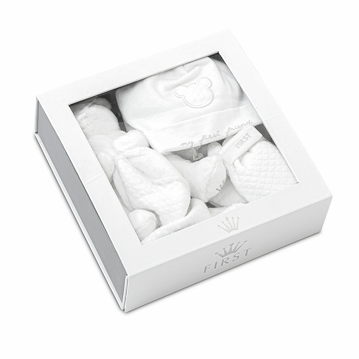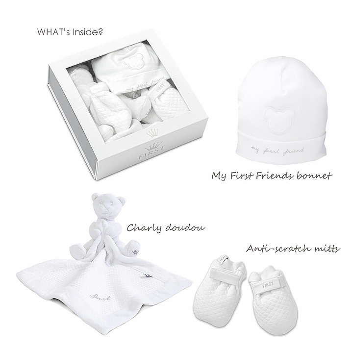 L'ensemble de maternité blanc, comprenant un doudou bob douillet, des moufles protectrices anti-griffures et un joli bonnet avec l'inscription « MES PREMIERS AMIS », est le cadeau idéal pour un premier bébé, garantissant qu'aucun élément essentiel ne soit...