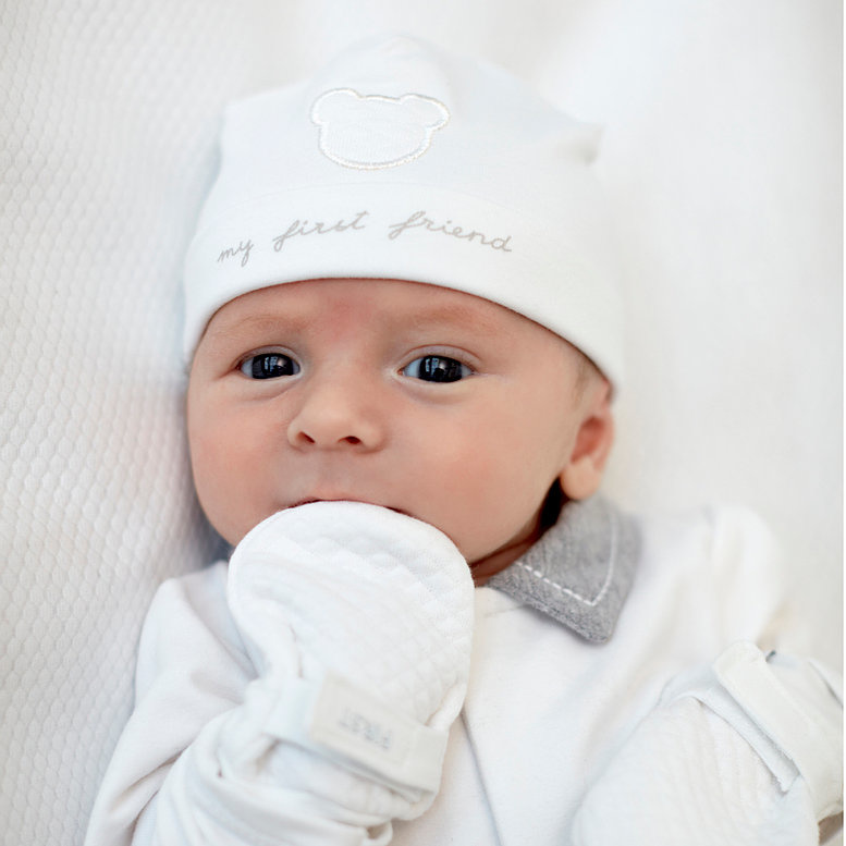 * Premier chapeau: Le premier chapeau a la broderie Premier ours en peluche et est fait de lycra et de jersey pour le confort de votre bébé.