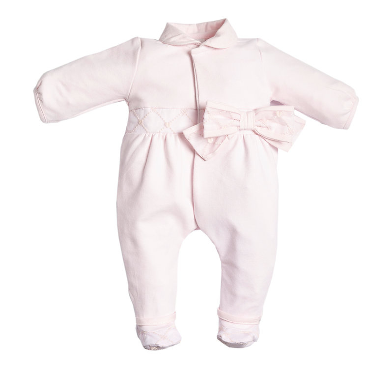 Elegante babyromper met lange mouwen en voetjes. Voorzien van een met ruitjes geborduurde FIRST-band en een opvallende strik aan één kant voor een vrouwelijke touch. Afgewerkt met bijpassende geborduurde voetzooltjes en een zachte kraag. Een knusse en verfijnde outfit voor pasgeborenen